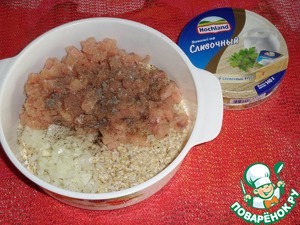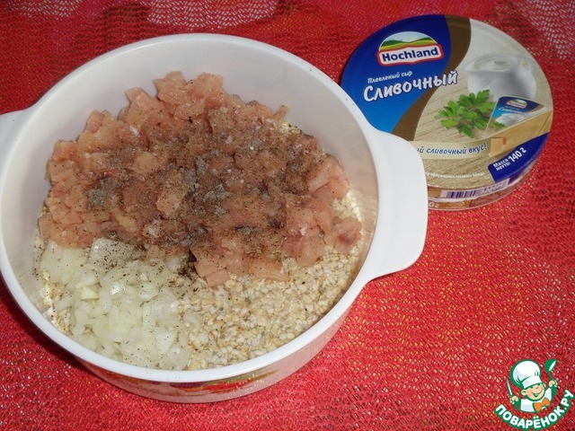 Выкладываем в чашку к овсянке нарезанный лук и куриное мясо. Солим и перчим по вкусу.
