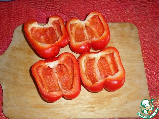Промытый перец разрезаем вдоль на 2 части и очищаем от семян.