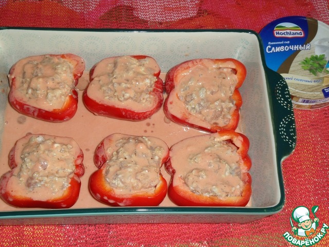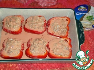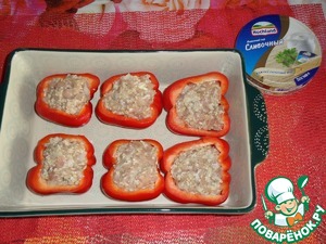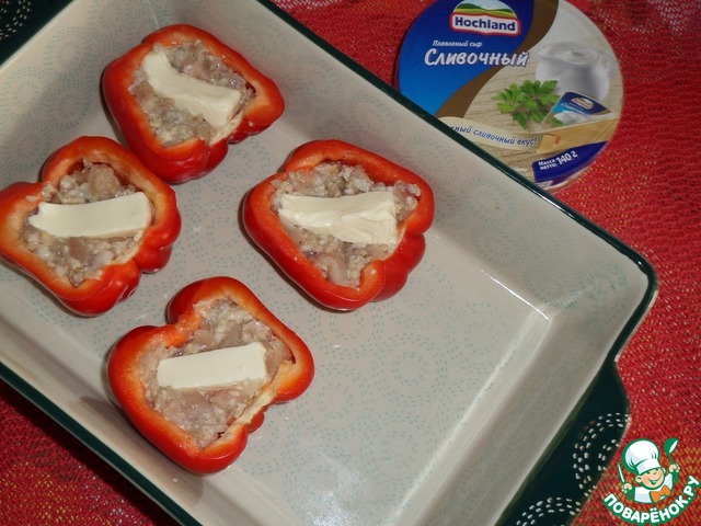 В глубокую форму для запекания выкладываем половинки перца. В каждую перчинку кладем немного мясной начинки и кусочек сыра ТМ "Hochland".