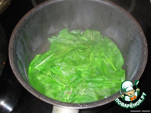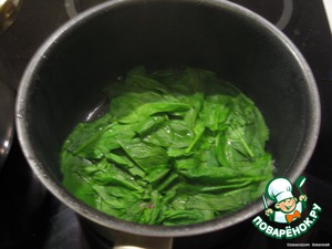 Шпинат перебрать и удалить стебли, уложить в большой сотейник, готовить на сильном огне под крышкой 3-4 минуты.