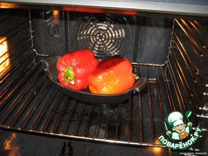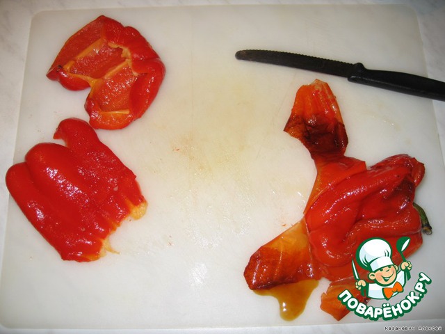 Сладкие перцы обмазать растительным маслом, запечь под грилем до черных подпалин, положить в термо пакет на 15 минут, ...