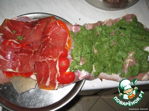 Шейку обсушить, разрезать вдоль так, чтобы кусок можно было открыть как книгу. Уложить на одну сторону «книги» хамон, на них - половинки запеченного перца. Сверху ровным слоем выложить массу из комбайна.