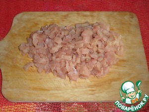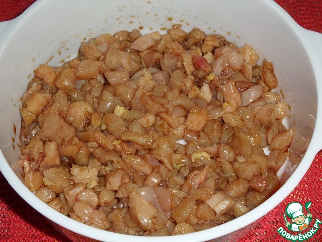 В разогретую сковороду наливаем 1 ст. л. растительного масла и выкладываем замаринованное куриное мясо.