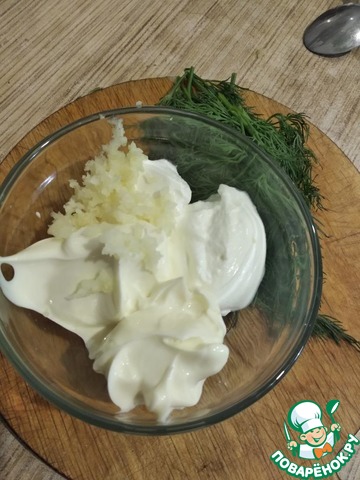 Готовим соус - смешиваем сметану, плавленый сыр, чеснок, пропущенный через пресс, нарезанную зелень, даем настояться.
