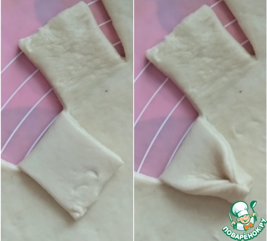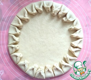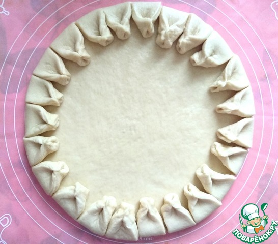 Раскатать тесто в круг, в центр положить форму для выпечки (у меня 28 см.). По краям сделать надрезы (как на фото). Теста получилось немного больше, чем надо, хватило ещё на 3 сосиски в тесте :).