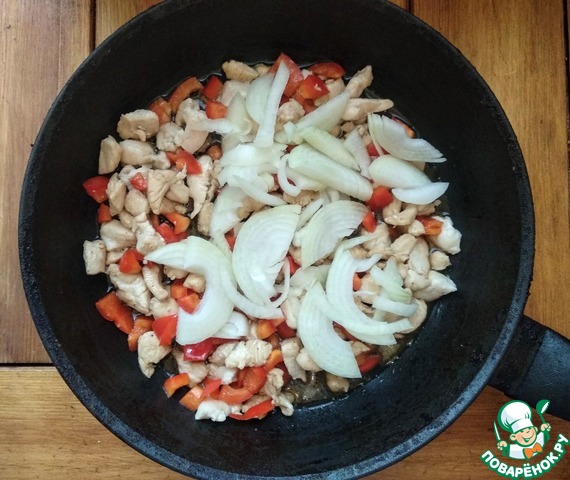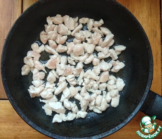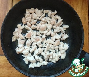 Пока тесто "подходит", приготовим начинку. Куриное филе мелко порезать, обжаривать на сковороде в оливковом масле 1-2 мин.