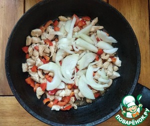 Затем добавить репчатый лук, нарезанный полукольцами, и болгарский перец, нарезанный кубиками.