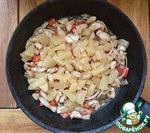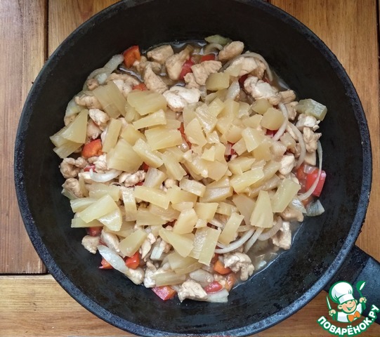 Добавить порезанные ананасы, соль и соевый соус. Обжаривать 7-10 мин. на среднем огне.