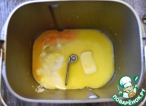 В ведёрко хлебопечке соединить теплое молоко, размягченное сливочное масло, сахар, соль, сметану, яйцо. -