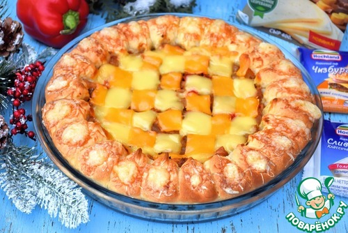 Сочетание курицы с ананасом многим знакомо, этот кисло-сладкий вкус я рекомендую испробовать в горячем пироге на воздушном дрожжевом тесте. А сверху украсим пирог плавленным сыром ТМ Hohland. Угощайтесь!