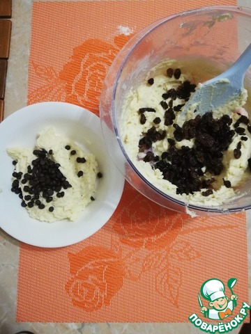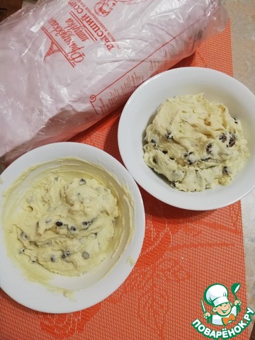 Готовое тесто разделить на 2 части. В одну часть добавить изюм, а во вторую шоколодные капли.