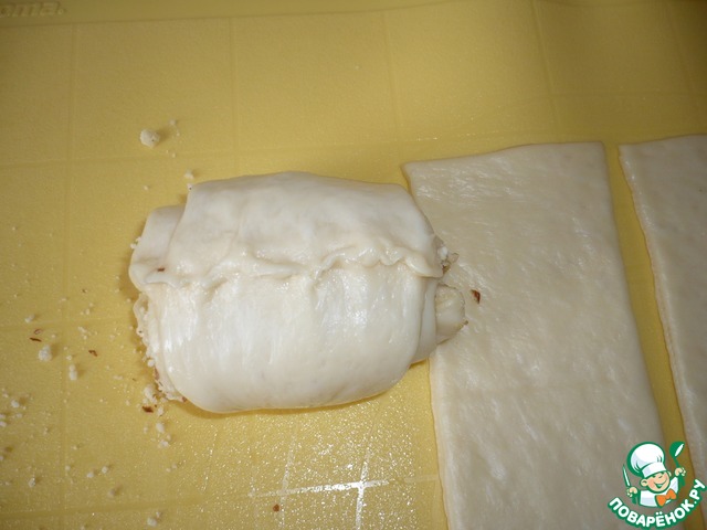 Теперь, чтобы оформить "бантик" обверните вокруг "сжатого" теста полоску (из обрезанного остатка теста), а затем сверните рулетик до конца.