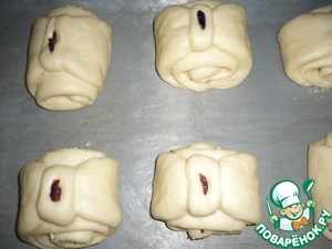 Точно также свернуть все булочки - рулетики. Выложить на противень застеленный пергаментной бумагой, накрыть пищевой пленкой и поставить в тёплое место на 15 минут. "Бантики"на булочках я украсила вяленой клюквой.