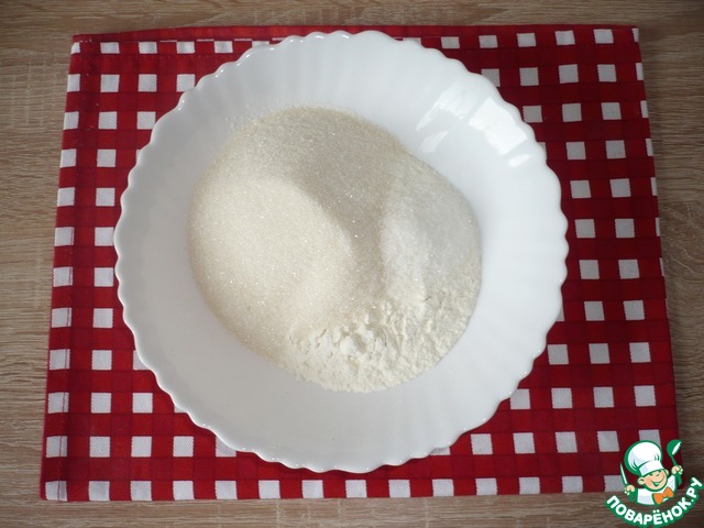 Пока тесто подходит, приготовим начинку. В чашке смешать муку пшеничную сорт "Экстра"- Французская штучка, сахар, ванильный сахар.
