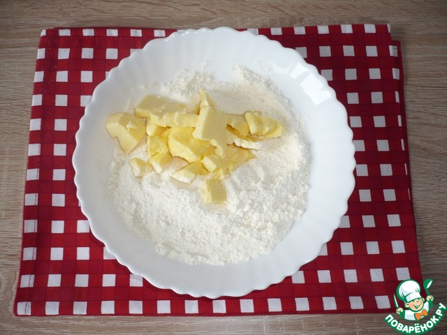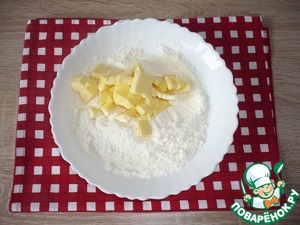 Добавьте холодное сливочное масло (60 г), все перетереть руками, чтобы получилась крошка.