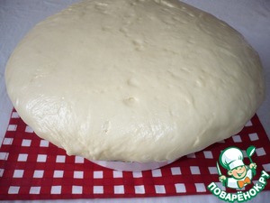 Замесить мягкое тесто. Миску смазать растительным маслом, положить тесто, накрыть пищевой пленкой, поставить в тёплое место на 1 час.