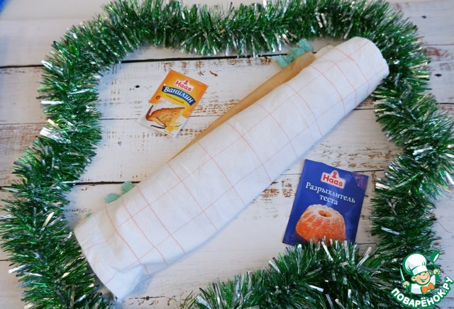 Готовый бисквит положить на заранее расстеленное полотенце. Закрутить в рулет и оставить остывать.
