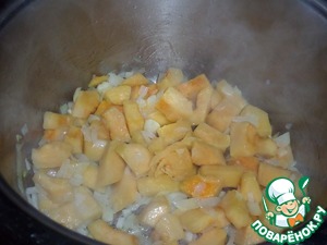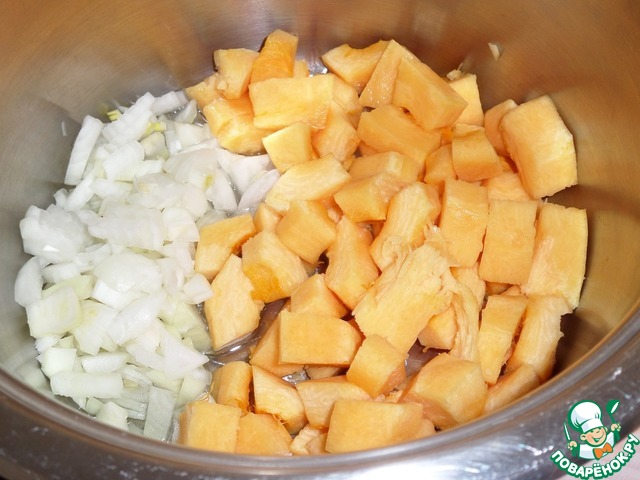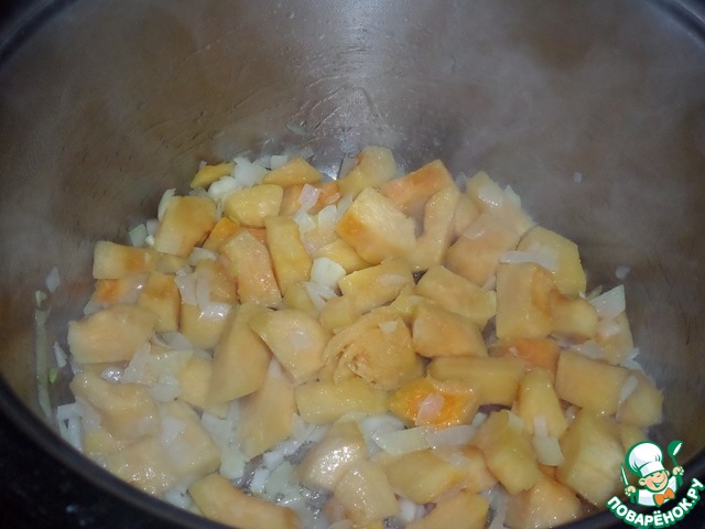 Кастрюлю с толстым дном ставим на огонь. Наливаем в нее 2 ст. л. растительного масла и выкладываем нарезанные овощи.