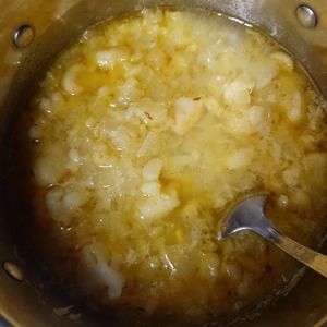 В кастрюле, где будете варить суп, растопить сливочное масло, положить мелко нарезанный репчатый лук и чеснок, обжарить до мягкости.