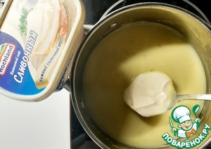 Добавить сыр плавленый и кокосовое молоко, довести до кипения, постоянно помешивая, снять с огня.