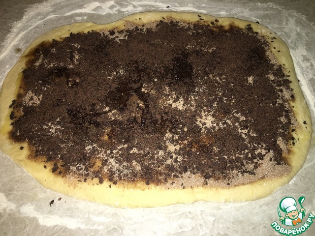 Для приготовления начинки растопить сливочное масло и немного остудить его. Натереть шоколад на крупной терке. Отдельно смешиваем сахар и корицу.