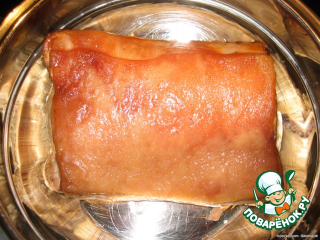 картинка шага Довести до кипения 2 л воды, добавить перец горошком, лавровый лист, гвоздику, ягоды можжевельника, половину головки чеснока, слегка раздавив неочищенные зубчики рукояткой ножа, соль. Готовить 10 минут, остудить. Уложить корейку в большую посудину, залить рассолом, что бы мясо было покрыто на 5 см. Оставить в холодном месте на 48 часов.