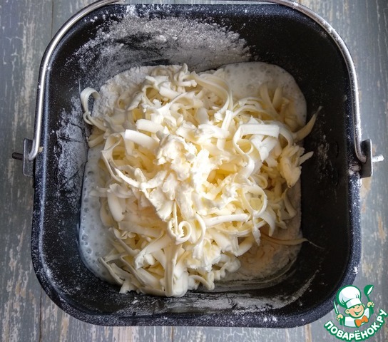 Тесто я буду замешивать в хлебопечке. В ведро хлебопечки налить кефир, добавить соду, соль и сахар, перемешать.