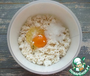 Для начинки творог соединить с яйцом и сахаром, перемешать.