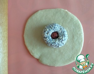 Тесто разделить на 15 частей. 14 частей раскатать в круг, в центр положить начинку.