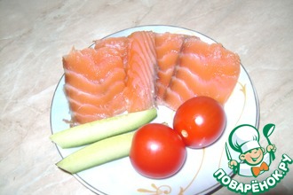 На вторую четверть листа нори кладём нарезанный малосольный лосось, на него нарезанный огурец.