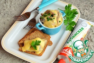 Третью четверть намазываем слоем творожного сыра, у меня Hochland.
