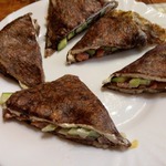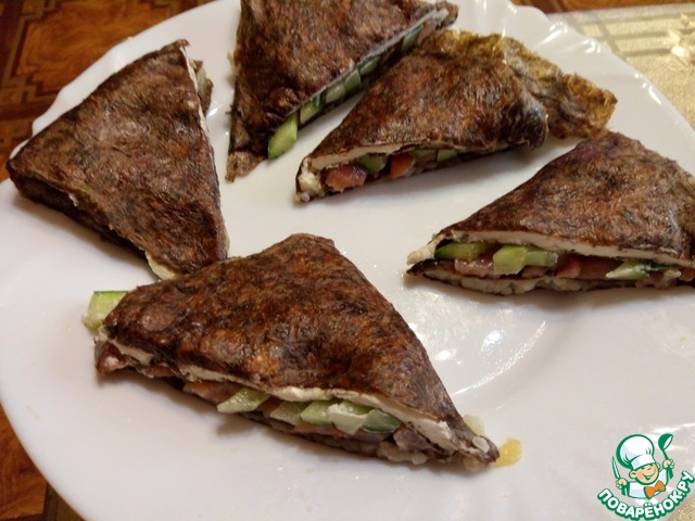 Далее первой четвертинкой листа нори накрываем четвертинку с лососем и огурцом.
