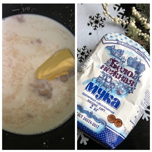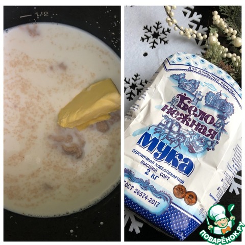 В тёплое молоко добавить соль, сахар, дрожжи и масло сливочное комнатной температуры. Перемешать.