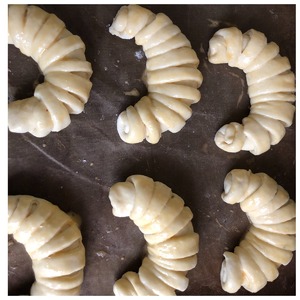 Подошедшее тесто обмять и раскидать на порционные шарики. Каждый раскатать в тонкий овал. Выложить джем и накрыть одной половинкой, хорошо прижав края. Другой край нарезать на тонкие полоски. Скрутить заготовку рулетиком и чуть согнуть полумесяцем.