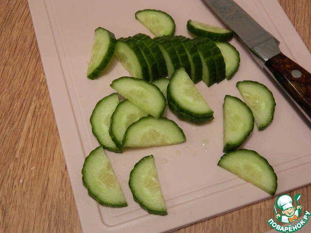 Огурец разрезать вдоль пополам и нарезать на кусочки, немного их срезать, чтобы стали поуже.