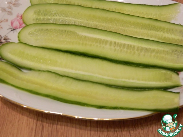 Огурцы нарезать тонкими пластинами. Содной стороны сделать маленькие надсечки наискосок не доходя до семян.