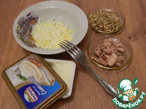 Сделать начинку. Смешать натертые яйца, орехи грецкие, размять вилкой консервы.
