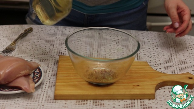 • Подготавливаем маринад для куриной грудки. В миску высыпаем приправу и смешиваем с небольшим количеством растительного масла.