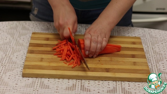 • Морковь моем, чистим и нарезаем соломкой.