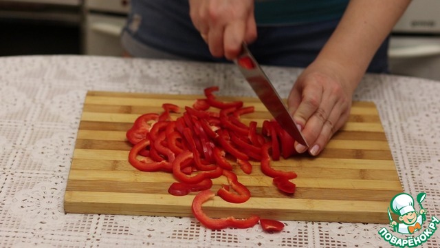 • Болгарский перец очищаем от семян и внутренних пленок. Нарезаем так же соломкой.