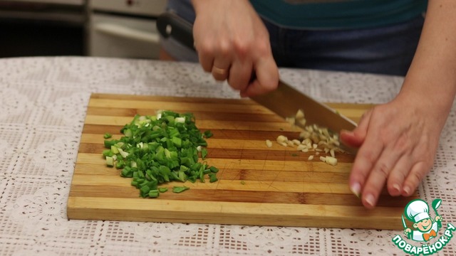 • Зеленый лук нарезаем перышками. Чеснок очистить и мелко покрошить.