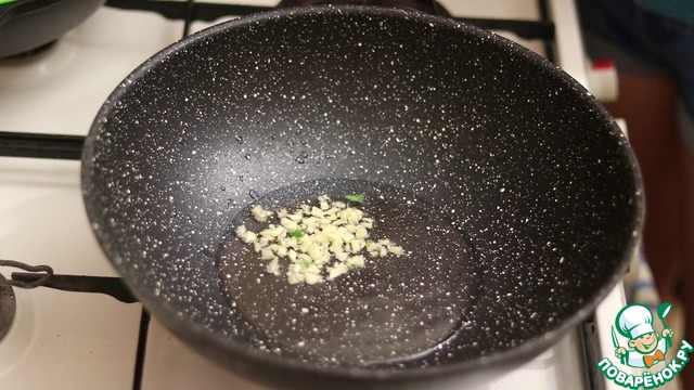 • В разогретый вок наливаем растительное масло. Разогреваем его и обжариваем чеснок.
