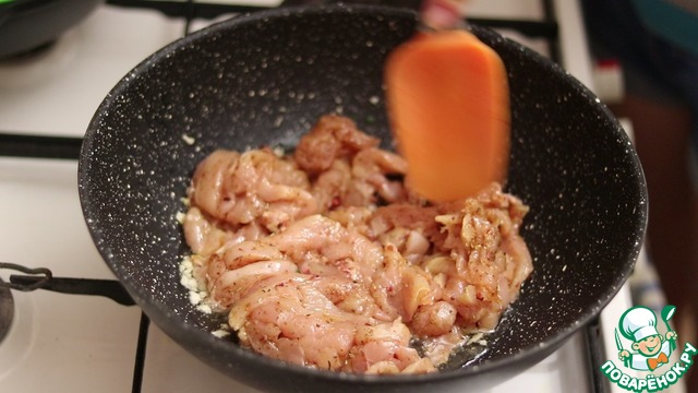 • Добавляем курицу и обжариваем на сильном огне.