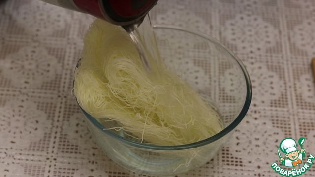 • Фунчозу заливаем кипятком. Оставляем на 5 минут, после сливаем в дуршлаг, что бы вся жидкость стекла.