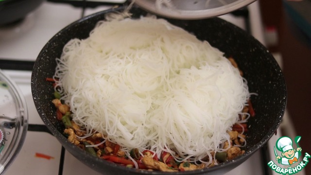 • Выкладываем фунчозу в вок и тщательно перемешиваем. Выключаем огонь, накрываем крышкой и оставляем на 10 минут.