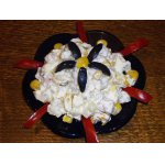 А можно просто все перемешать. В этот вариант я положила ветчину напополам с отварной курицей. Так мне понравилось даже больше, хотя выглядит и не так красиво.