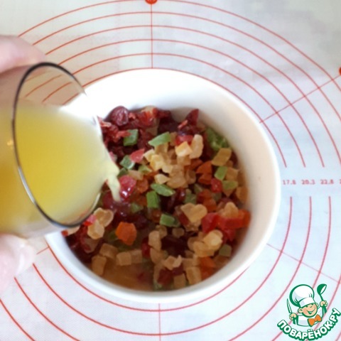 • Цукаты и вишню нарезать на небольшие кусочки, залить апельсиновым соком, я еще добавила пару капель ромовой эссенции, оставить настаиваться на 1-2 часа.