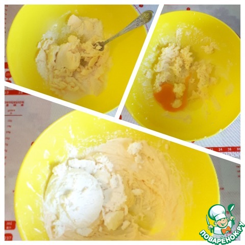 • Маргарин перемешать с сахаром, немного взбить, добавить яйцо, опять все взбить. Добавить творог или Рикотту, если творог неоднородный, то пробить его блендером.