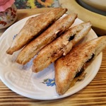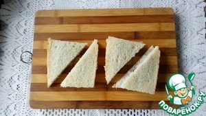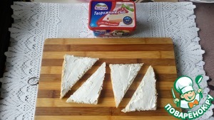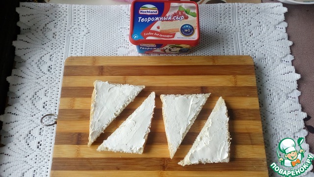 Хлеб разрезать по диагонали на 2 части. На половину намазать творожный сыр.