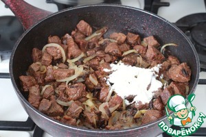 Пассеровать лук до золотистой корочки. Далее добавить 1 ст. ложку муки. Обжарить мясо вместе с луком и мукой в течение 5-10 мин.